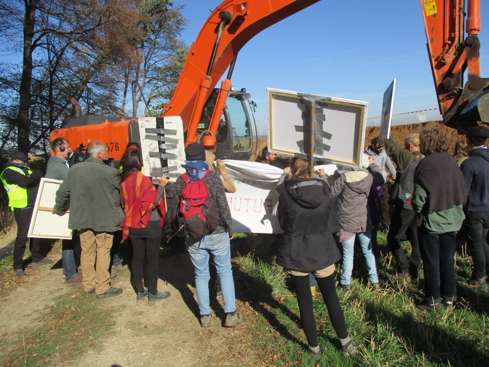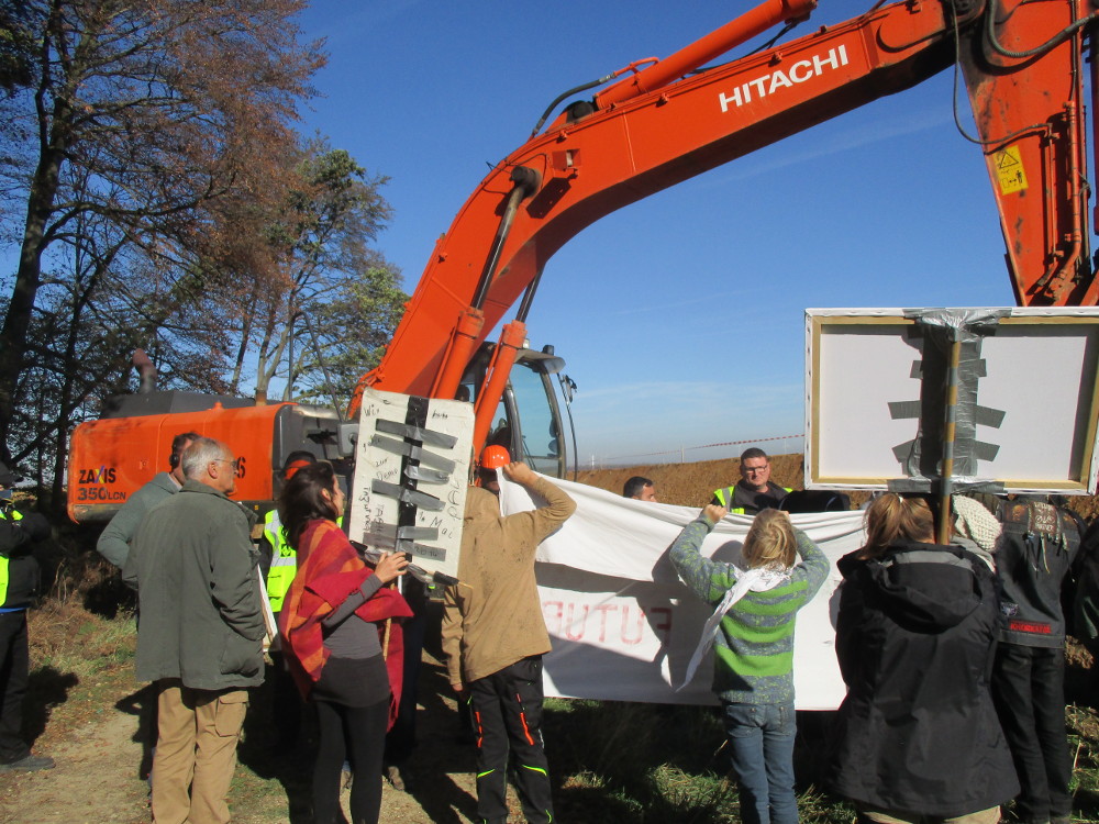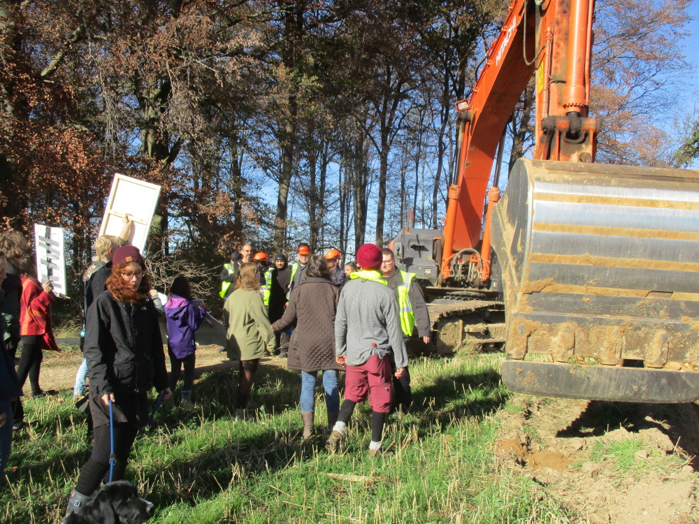 Der Bagger musste seine Arbeit komplett unterbrechen und zog sich Richtung Abbruchkante zurück, wo er auch hingehört. Der Graben selbst, als Gefährdung für Spaziergänger*innen, kann nun auch nach dem Scheitern der Rodungsarbeiten in diesem Jahr zugeschüttet werden – zum Beispiel von den vielen Tausend Menschen die in den nächsten Tag den Wald wieder in Besitz nehmen.
