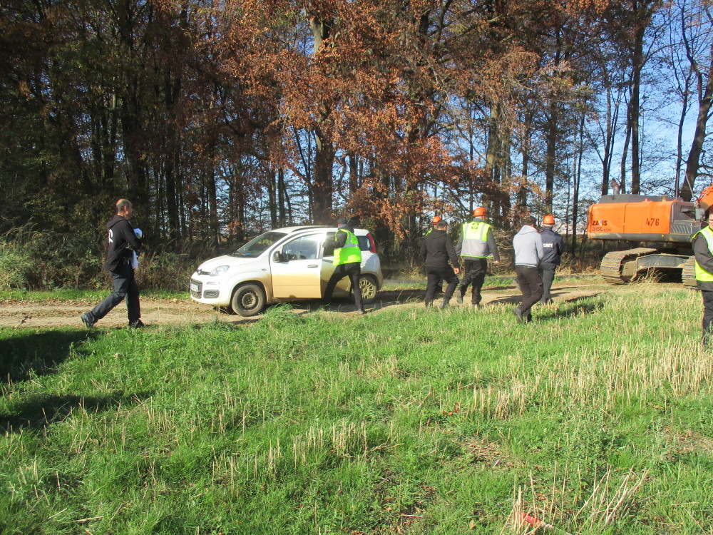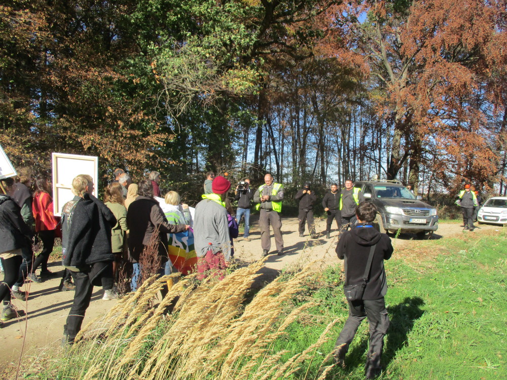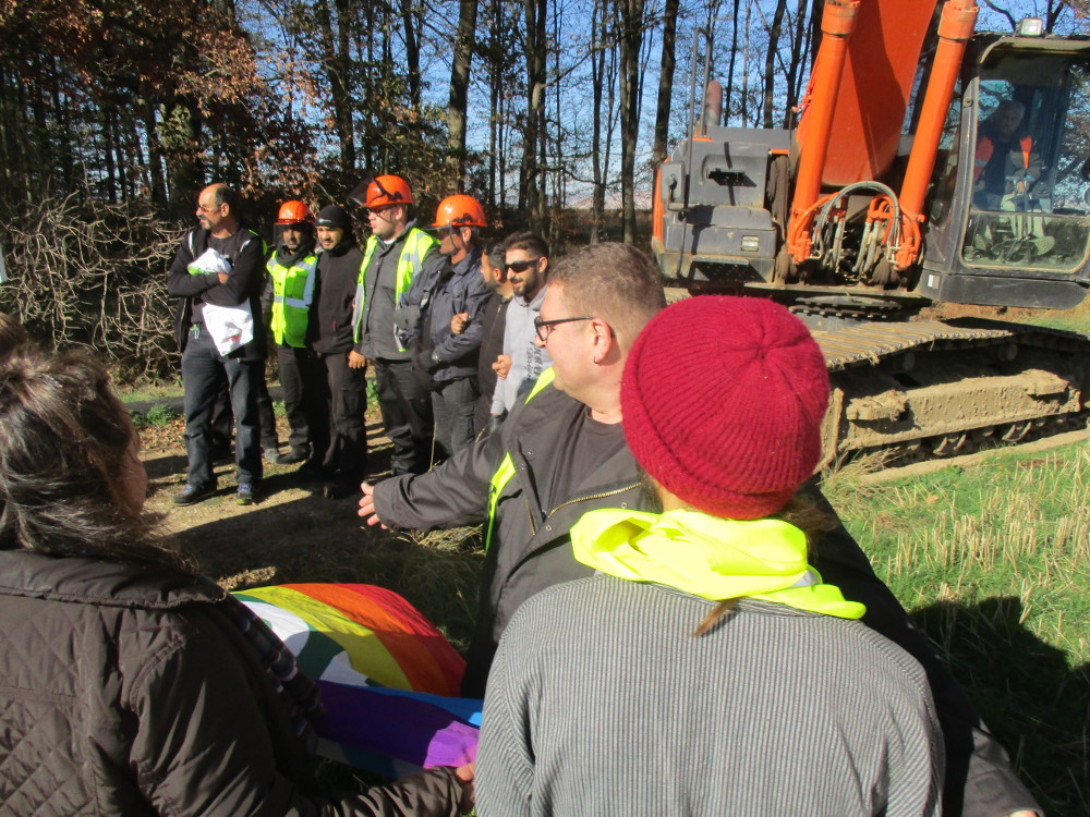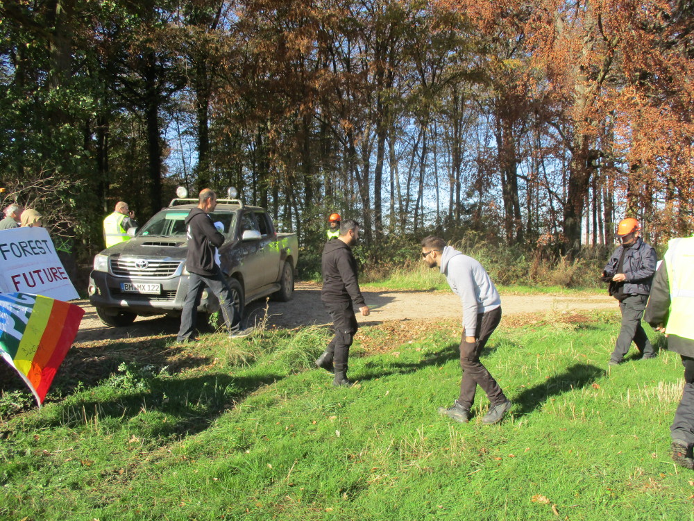 Die RWE-Mitarbeiter sind schnell in die Autos gestiegen und haben den Ort verlassen. Der Baggerfahrer arbeite indes weiter. Gleichzeitig kamen zwei Fahrzeuge der Sicherheitsfirma (IWSM – Industrie – Werk – Schutz Mundt), sprangen aus den Autos und zogen sich vereinzelt Handschuhe an. Ein anwesendes Kamerateam schützte durch seine Anwesenheit. Denn einer der security Leute (namentlich bekannt unter Carlo C.) machte Anstalten einzelne Menschen der Gruppe körperlich anzugreifen. So zum Beispiel auch einem Hambi-Journalisten mit erhobenen Presseausweis den Fotoapparat wegzureißen.