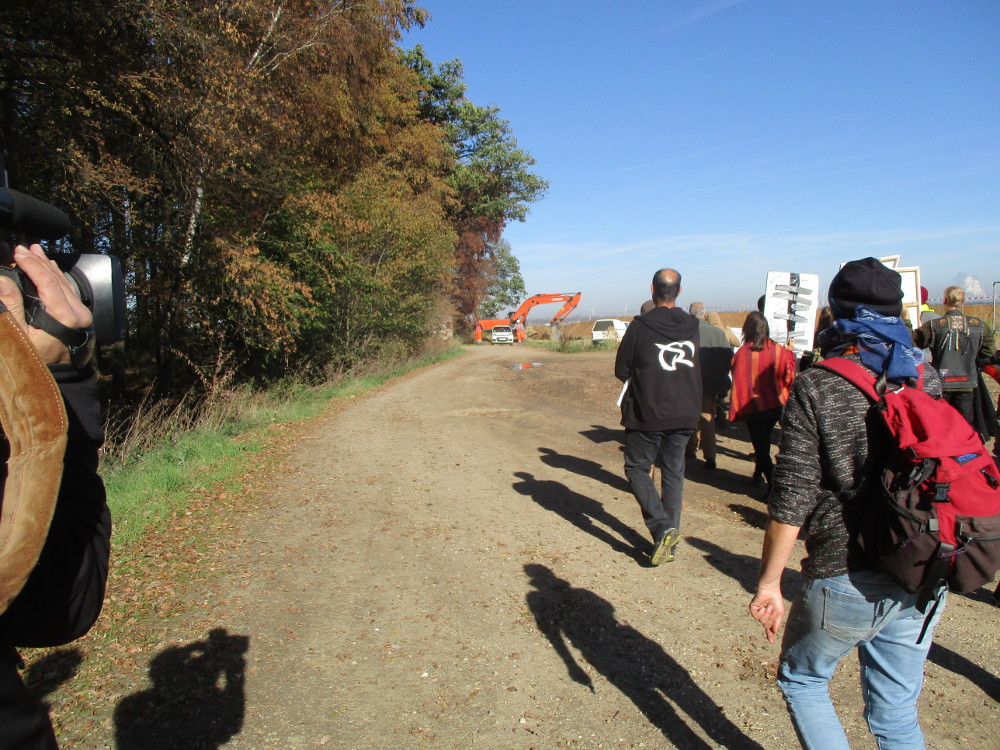 Die Wallanlagen sind in die Höhe auf ungefähr 2.50 Meter aufgeschüttet mit Kies und Erde und mit Flatterband versehen. Die direkt dahinter liegende Grube ist auf einen Tiefe von ungefähr 2.80 Meter ausgebaggert worden. Markierungshölzer sind beschriftet mit „Rohrleitungen“. Dieser Beschriftung ist nicht unbedingt Glauben zu schenken, weil der Wall auch als Absperrung dient um die Umfriedung des nächsten Rodungsabschnittes vorzubereiten, der mit dem aktuellen Gerichtsurteil vorläufig erst mal auf Eis liegt.