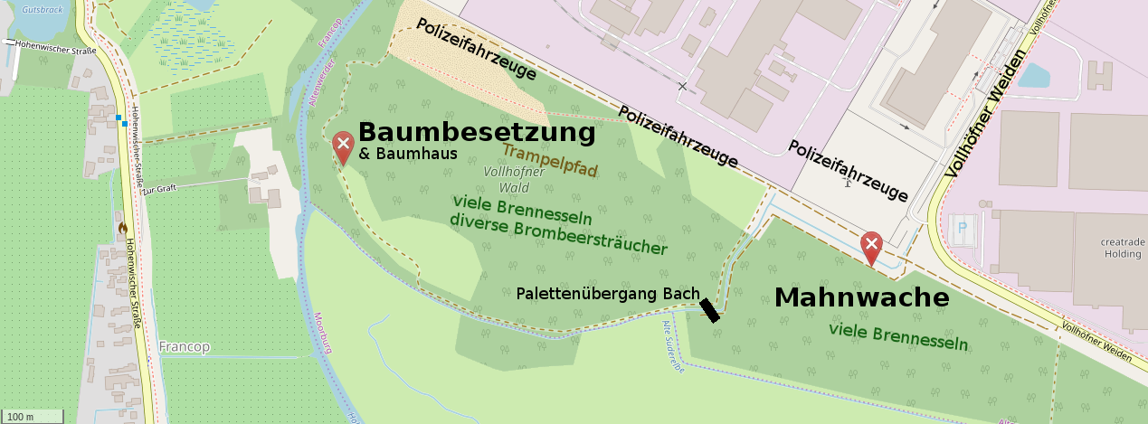 Die Polizei lässt Menschen auf dem Hauptweg nicht durch, allerdings ist es möglich sich auf wenigen Trampelpfaden und quer durch Brennesseln durch den gesamten Wald zu bewegen.